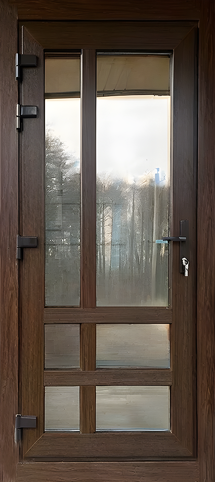 Прочная уличная ПВХ-дверь с ламинацией под дерево и отличной теплоизоляцией.